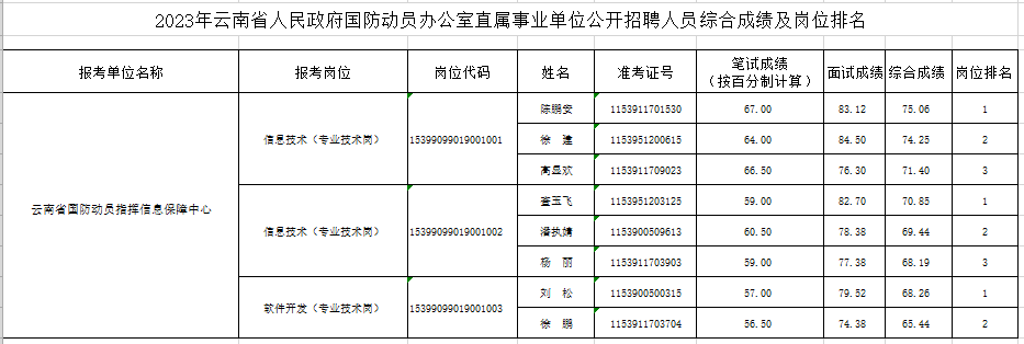 附件:2023年云南省人民政府国防动员办公室直属事业单位公开招聘人员综合成绩及岗位排名.xls