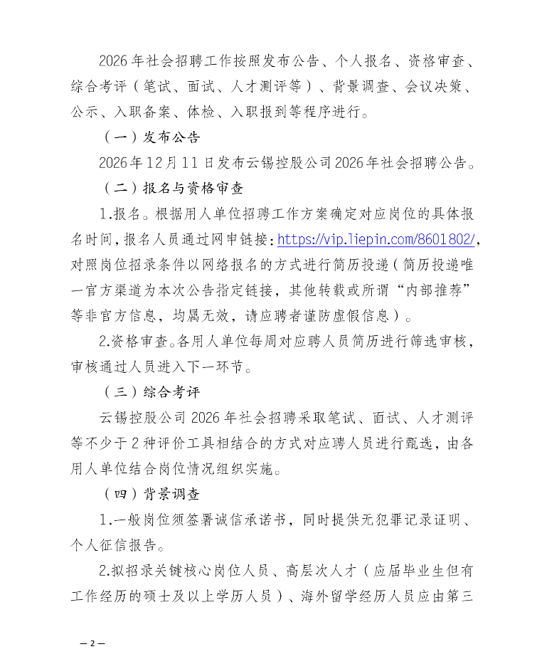 云南锡业集团(控股)有限责任公司2026年社会招聘公告