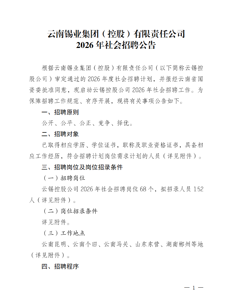 附件【附件:云南锡业集团(控股)有限责任公司2026年社招计划岗位明细表 .pdf】 来源:https://www.ytc.cn/info/1226/15912.htm