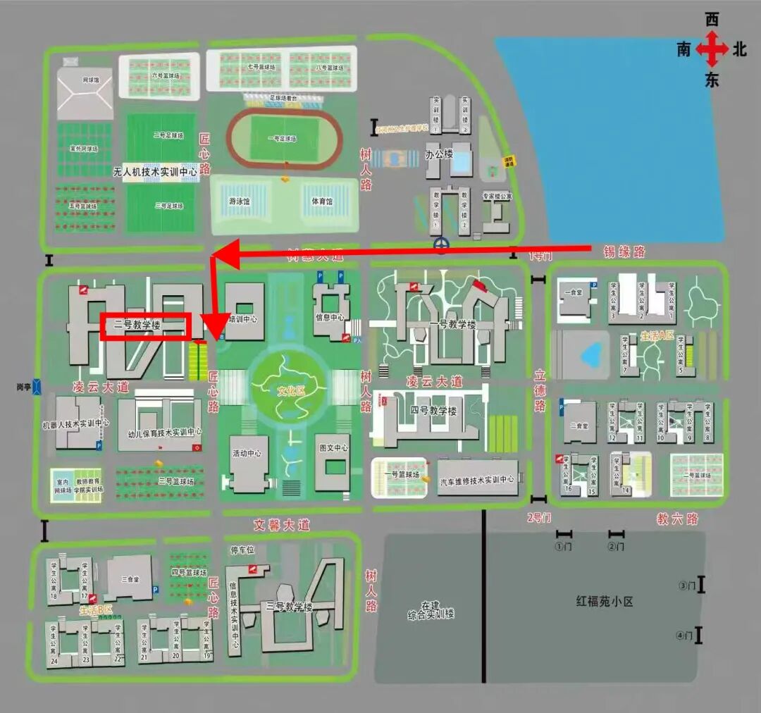 红河职业技术学院(2号教学楼):红河州蒙自市上海路延长线红河州职教园区1号门(北门)直走700米左转