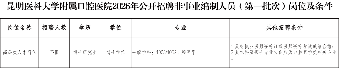 2026年昆明医科大学附属口腔医院招聘非事业编制人员(第一批次)公告