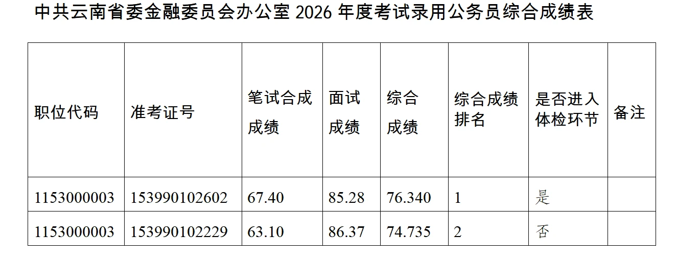 综合成绩按照笔试合成成绩、面试成绩各占50%的比例合成,笔试合成成绩、面试成绩四舍五入后均保留至小数点后2位,综合成绩四舍五入后保留至小数点后3位。详见附件《中共云南省委金融委员会办公室2026年度考试录用公务员综合成绩表》。