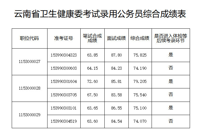 2026年云南省卫生健康委考试录用公务员综合成绩及体检公告