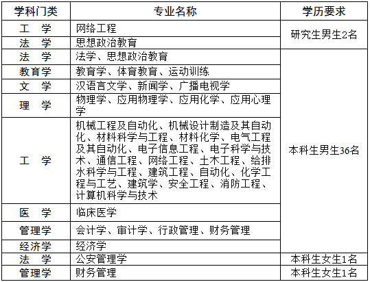 我总队接收普通高等学校2018年应届毕业生40名。其中,男生38名,女生2名,具体接收专业及人数如下: