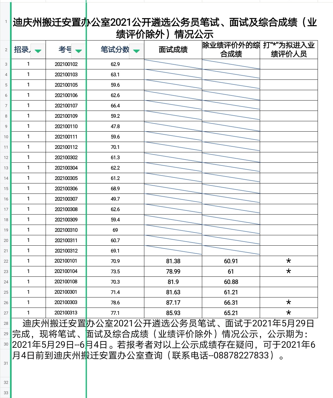 迪庆州搬迁安置办公室 2021公开遴选公务员笔试、面试及综合成绩(业绩评价除外)情况公示