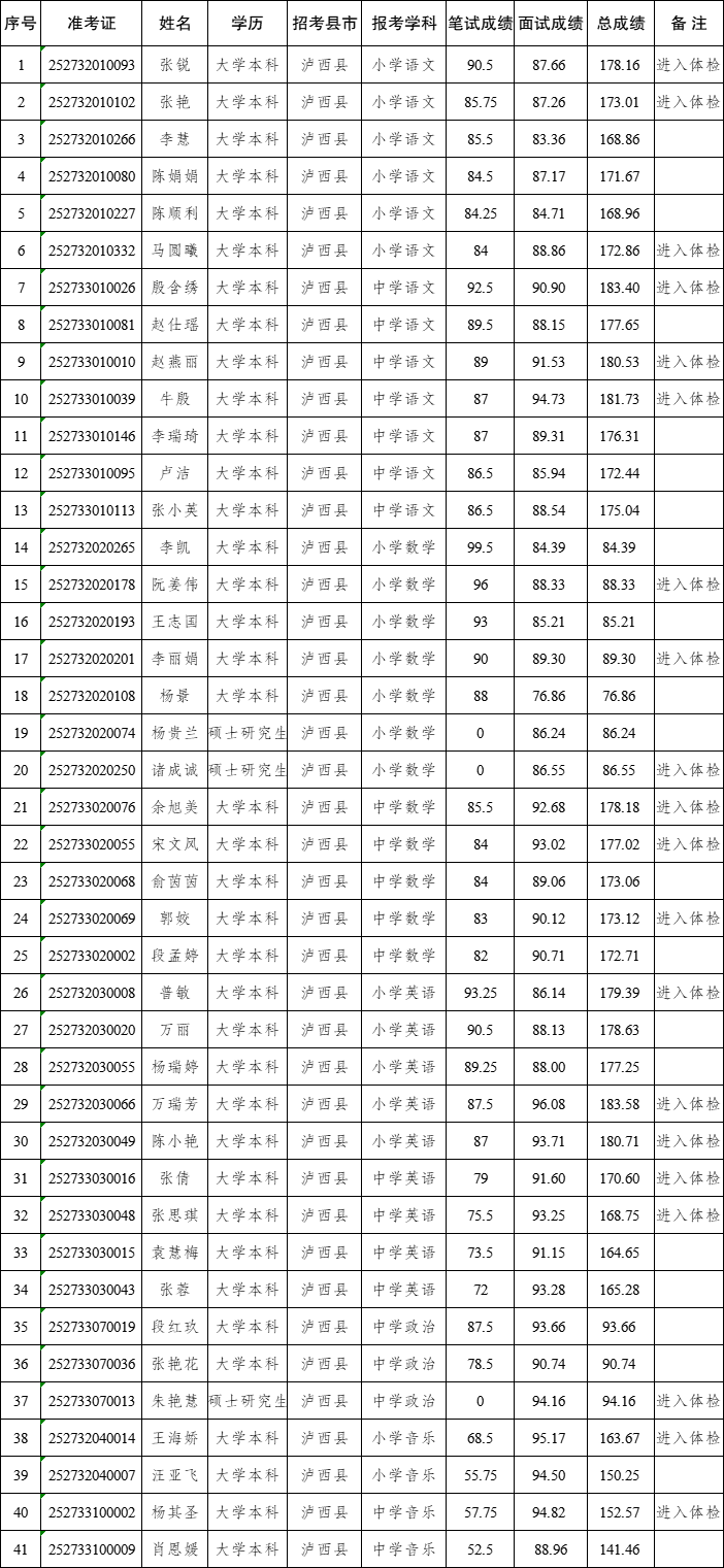 按照《红河州教育体育局关于2023年中央特岗教师招聘考试的公告》《红河州教育体育局关于2023年中央特岗教师招聘资格复审及面试的公告》要求,泸西县2023年中央特岗教师招聘工作于2023年8月9日按照面试程序和要求已全部结束,现将泸西县2023年中央特岗教师招聘成绩以予公告如下: