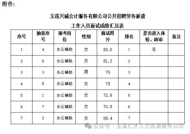 附件:玉溪兴诚会计服务有限公司公开招聘劳务派遣工作人员公告面试成绩汇总表