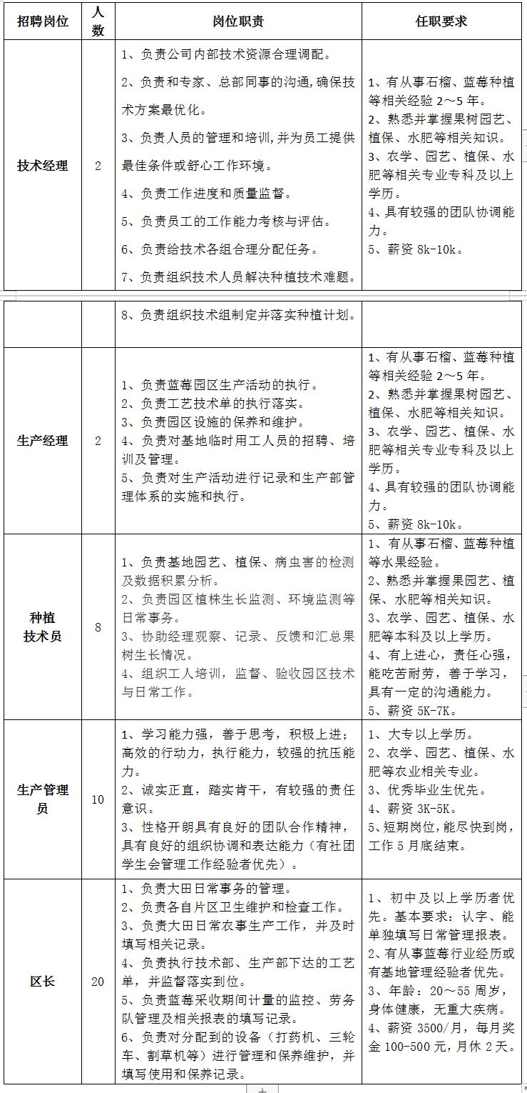 蒙自海升现代农业有限公司是58集团五八农业下属的全资子公司。公司为2018年蒙自市重点招商引资企业,云南省级龙头企业。从事规模化纯基质蓝莓种植1200亩,及Y字型搁架模式软籽石榴种植3000亩,正在建设的蓝莓二期项目,于2023年7月开始,将石榴基地中的1400亩改种为设施蓝莓,共投资1.4亿,均采用高标准现代化的欧洲种植模式。同时,配有国际化、高标准的冷链物流和自动化的包装生产线;以践行农业现代化、标准化生产,达到优质高产、节能高效、生态环保,实现“以点带面”的示范效果,提高当地居民的就业率,全面推进科技兴农,加快农业现代化生产的进程。现诚招如下精英: