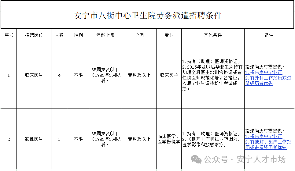 3.资格审查:凡报名人员通过微信投递简历成功的,均由第三方人力资源公司负责在线上进行资格审查,资格审查通过后,连同报名资料一并报安宁市八街中心卫生院复审,复审结束后确定笔试人员。