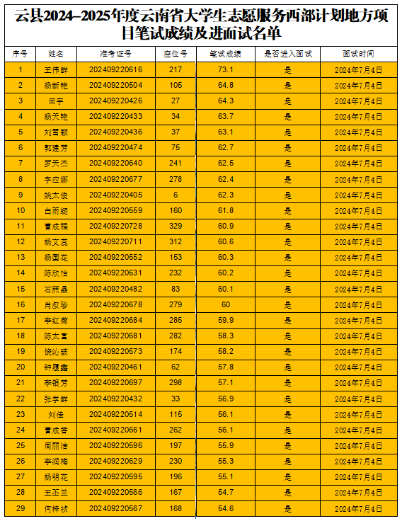 云县2024-2025年度云南省大学生志愿服务西部计划地方项目志愿者笔试相关工作已结束,现将笔试成绩进行公示。