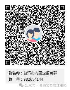 (四)招聘工作期间,报考人员应及时关注招聘工作信息(微信公众号“普洱宝力管理服务”,二维码附后),并扫码加入本次招聘考试QQ群(二维码附后);保持联系电话畅通,因通讯不畅等原因导致相关后果由报考人员本人承担。