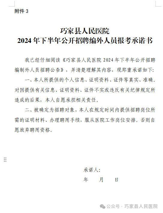 3、巧家县人民医院2024年下半年公开招聘编外人员报考承诺书