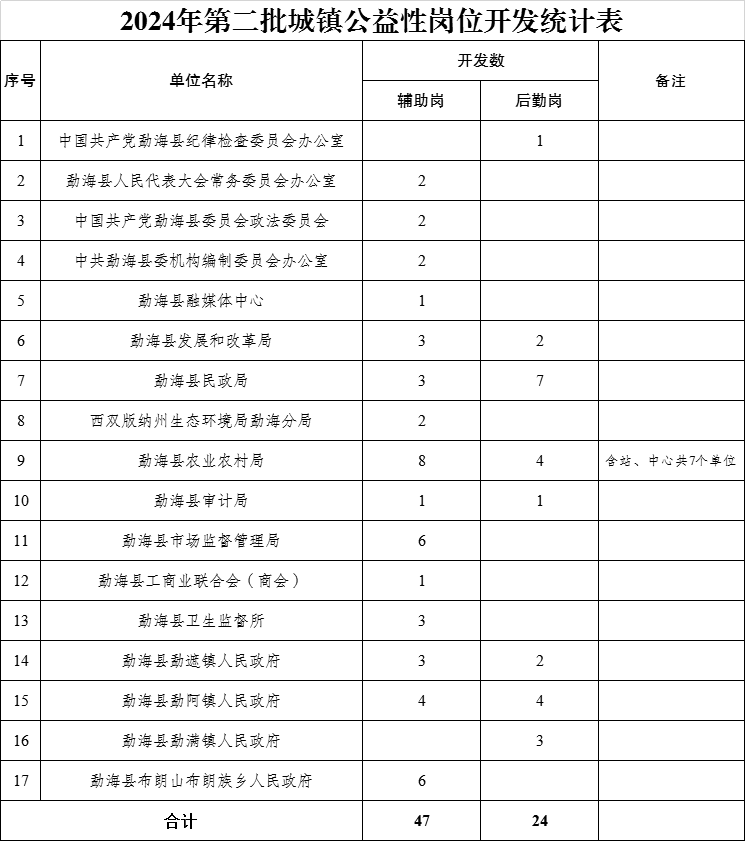 招聘岗位71个。具体招聘岗位数量详见《勐海县2024年第二批城镇公益性岗位开发统计表》。