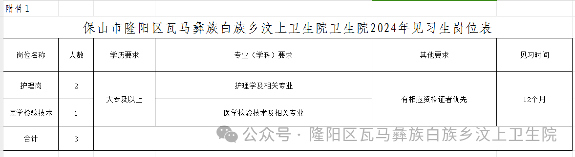 本次招聘见习生3人,其中:护理岗2人;医学检验技术岗1人。详见附件1:《保山市隆阳区瓦马彝族白族乡汶上卫生院2024年见习生岗位表》。