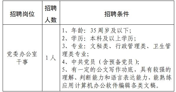根据医院业务发展需求,现党委办公室需招聘干事1名,具体招聘条件如下: