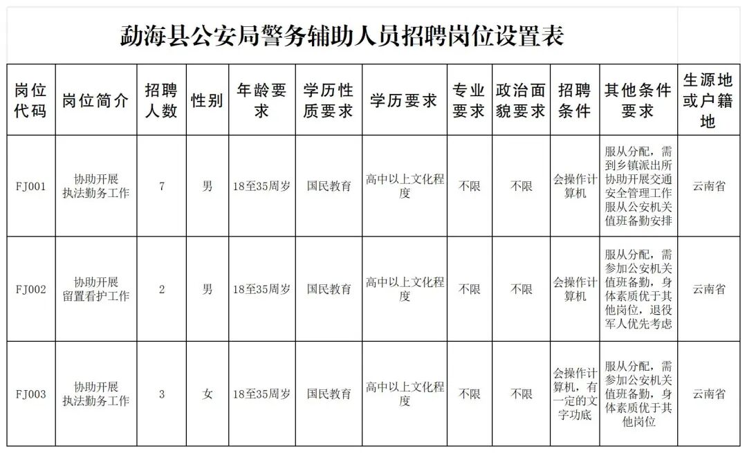 本次共招聘辅警12人,主要在勐海县公安局协助开展执法勤务工作等工作。辅警不具有人民警察和公务员身份,不行使人民警察职权。具体岗位见《勐海县公安局警务辅助人员招聘岗位设置表》