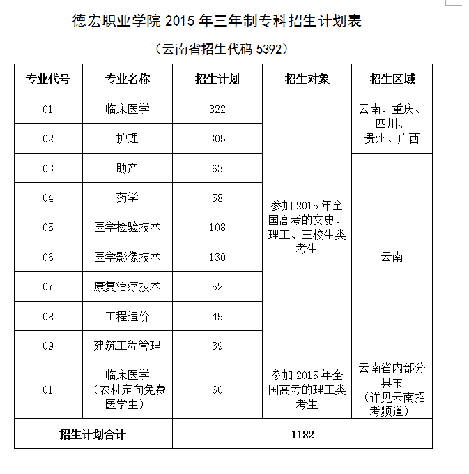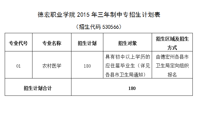 德宏职业学院2015年招生计划表