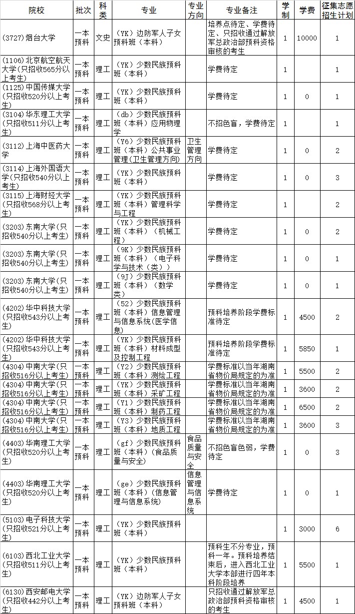 2015年云南省普通高校招生一本预科征集志愿招生计划