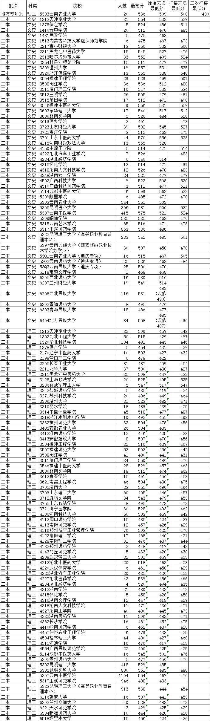 2015年云南省普通高校招生二本二次征集志愿招生计划
