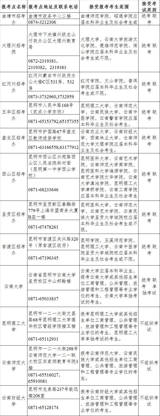 (1)所有考生均应在规定时间内到云南省招生考试院指定的报考点现场核对并确认网上报名信息,逾期不再补办。应届本科毕业生原则上应选择就读学校所在州(市、区)的报考点办理网上报名和现场确认手续;单独考试考生应选择在报考的院校办理网上报名和现场确认手续;报考工商管理、公共管理、旅游管理和工程管理等专业学位的考生应选择在云南省招生考试院指定的报考点办理网上报名和现场确认手续;其他考生应选择工作或户口所在地州(市、区)的报考点办理网上报名和现场确认手续。