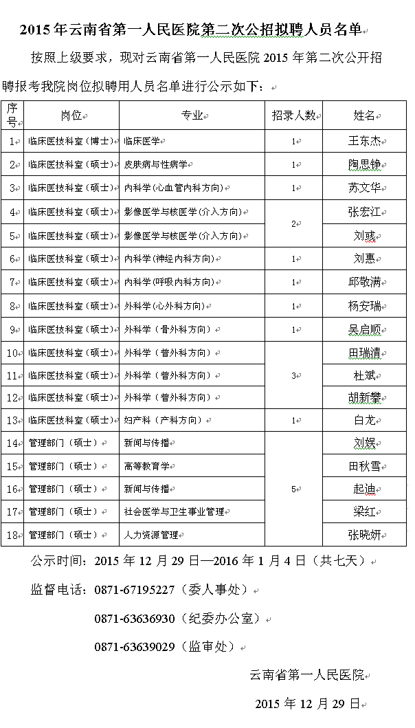 2015年云南省第一人民医院第二次公招拟聘人员名单