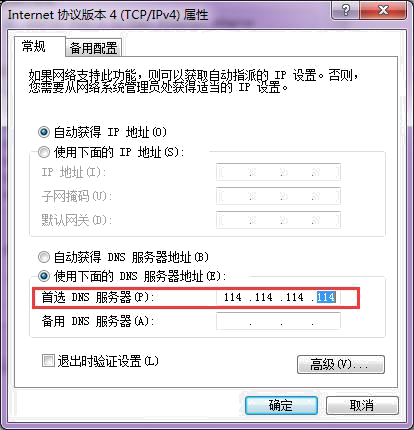 2)更改DNS服务器设置:114.114.114.114