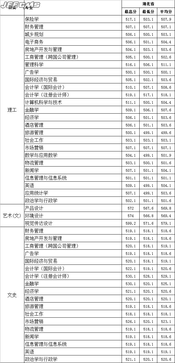 云南财经大学2015年湖北省录取情况一览表