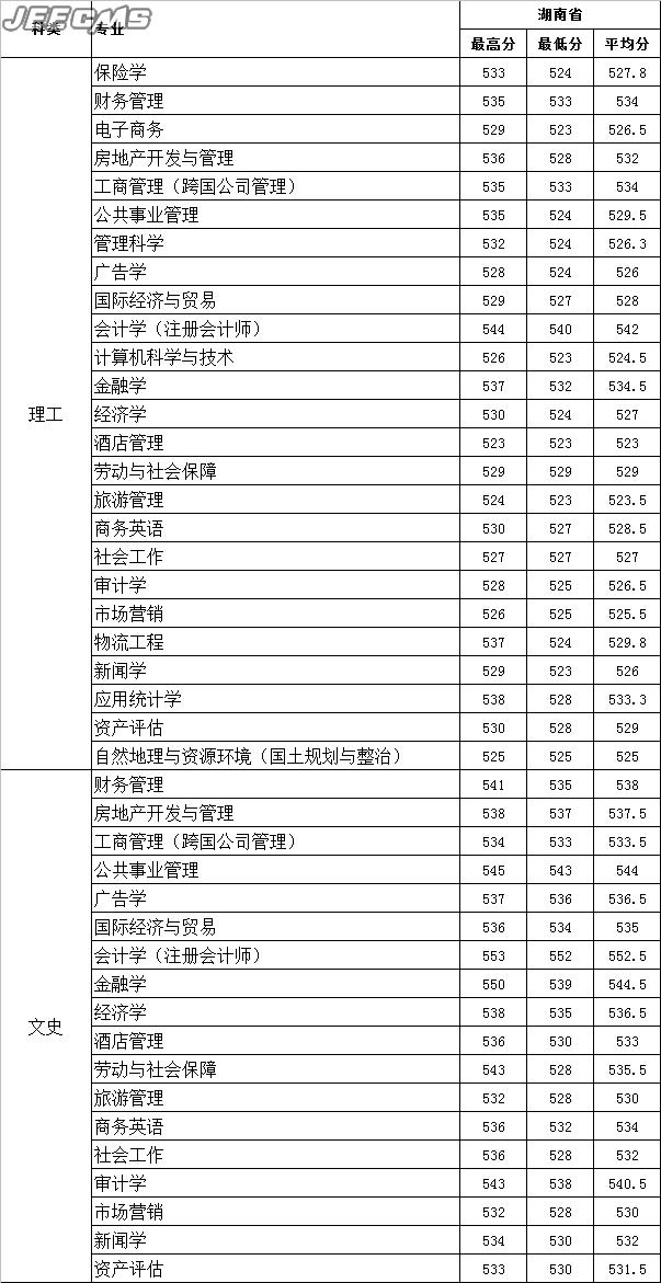 云南财经大学2015年湖南省录取情况一览表