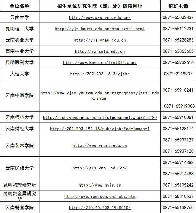 2016年云南省硕士研究生招生单位成绩复核期间联系方式