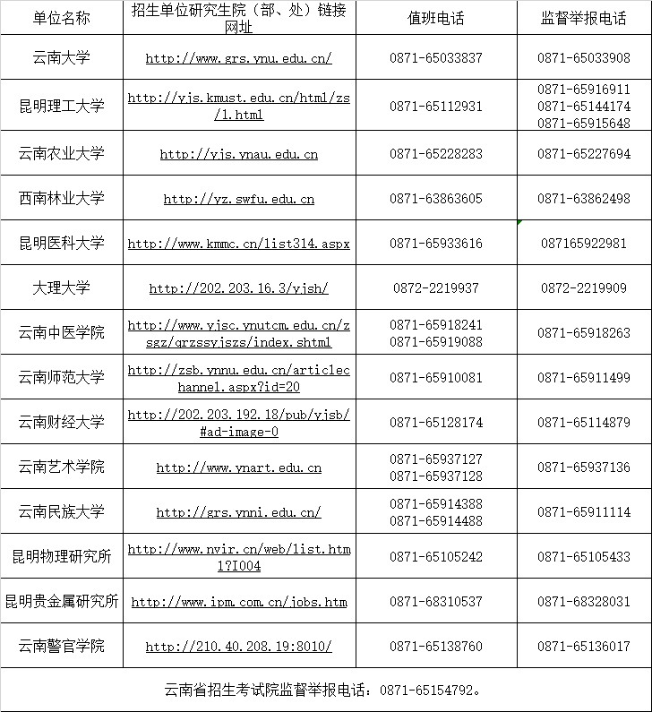 云南省2016年硕士研究生复试工作将陆续展开,具体复试时间由各招生单位确定,请考生密切关注招生单位研究生招生信息网的有关信息。为更好地服务考生,方便考生咨询,我省将公布各研究生招生单位联系方式及监督举报电话。教育部将于3月18日至4月30日在“中国研究生招生信息网”(公网网址:http://yz.chsi.com.cn,教育网网址:http://yz.chsi.cn)开通“全国硕士研究生招生调剂服务系统”。请符合条件且有调剂愿望的考生及时上网了解调剂信息和调剂系统的使用方法,并按要求申请调剂。