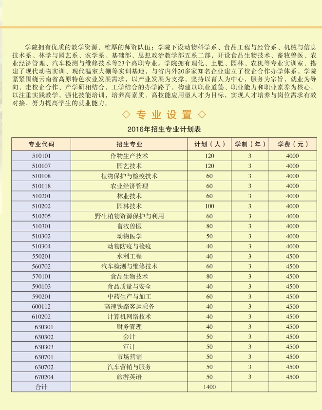 玉溪农业职业技术学院2016年专科招生专业