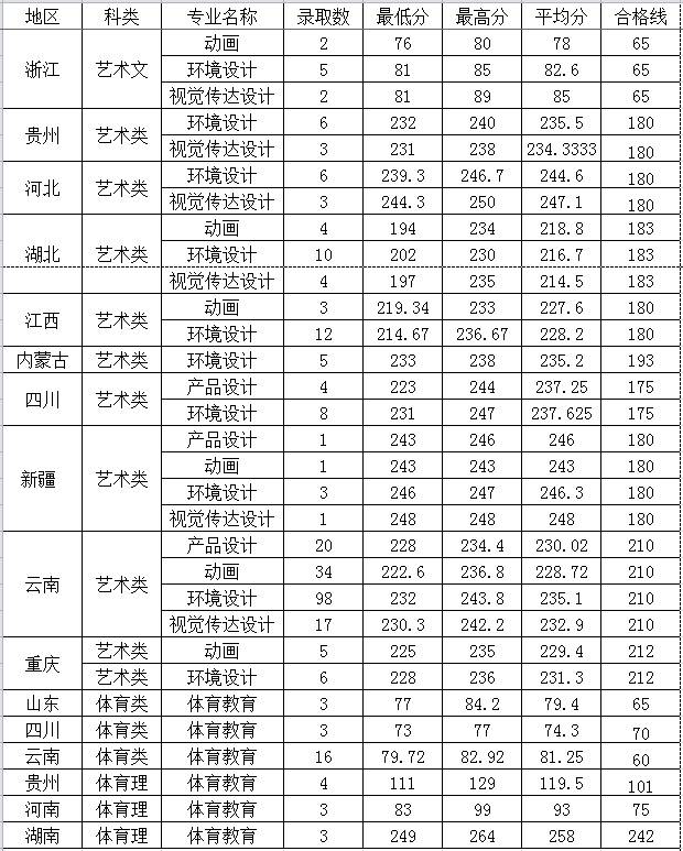 注:2016年我校按文化、专业成绩双过线,投档后按专业成绩择优录取。表中所列成绩均对应相关科类的专业分数。艺术采取省美术统考成绩、体育采用省体育统考成绩。