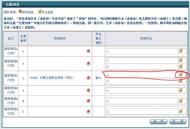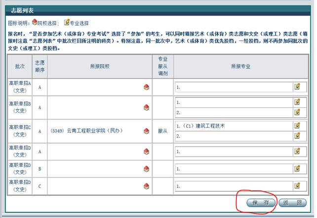 最后一步,点击“保存”,然后点击“返回”。最后,到报考确认点进行交费、确认志愿后,方生效。