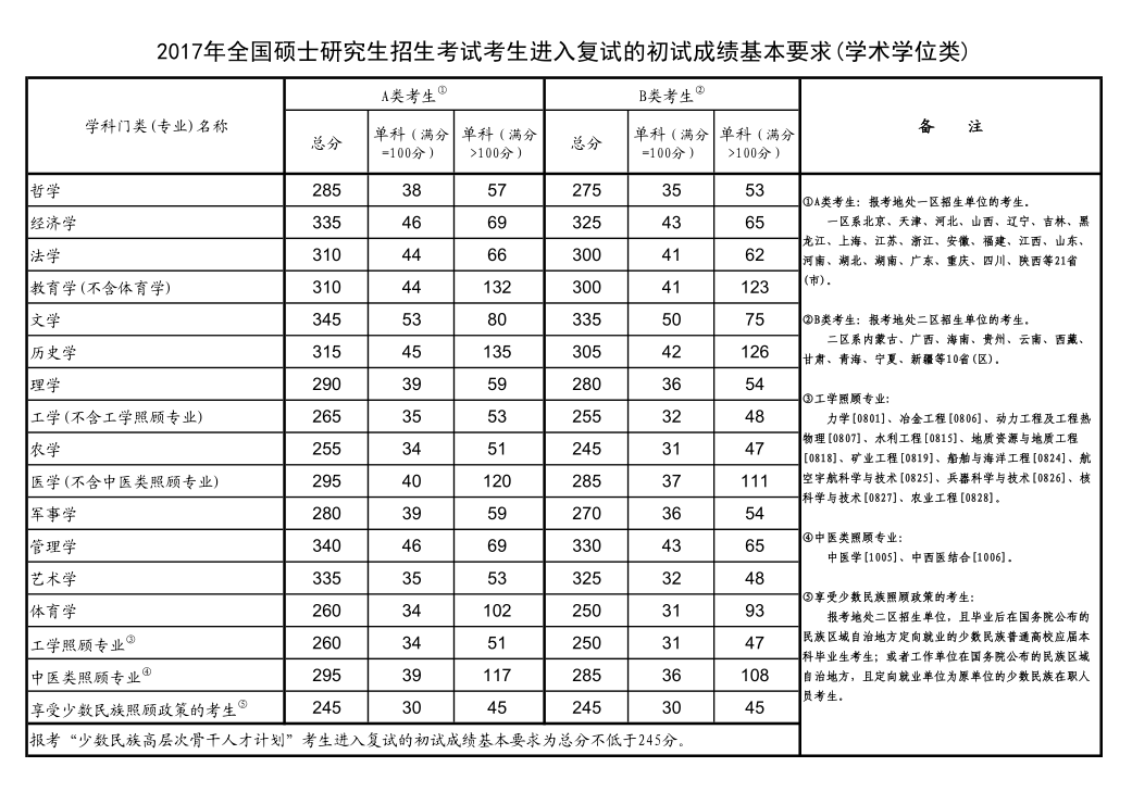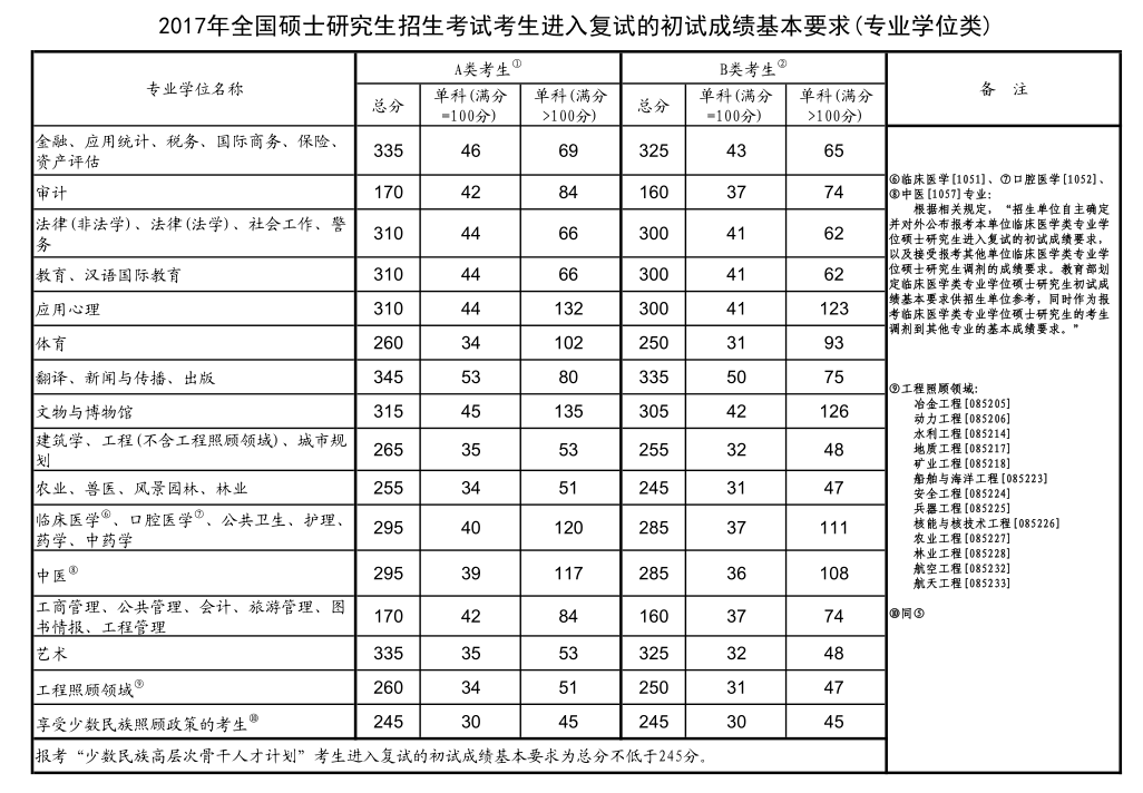 云南省2017年全国硕士研究生招生考试复试初试成绩基本要求