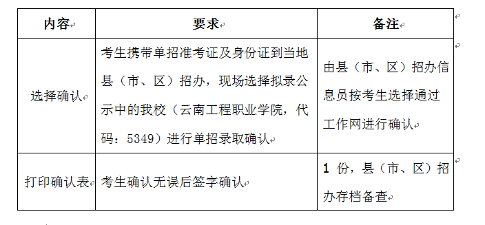 (二)2017年4月5日8时—4月7日18时单招拟录院校专业确认。云南省招考频道网上公示拟录名单中的考生,必须到当地县(市、区)招办进行签字确认,被两所及以上院校拟录公示的考生,只能选择一所院校进行签字确认。不参加签字确认的考生视为自动放弃单招录取。