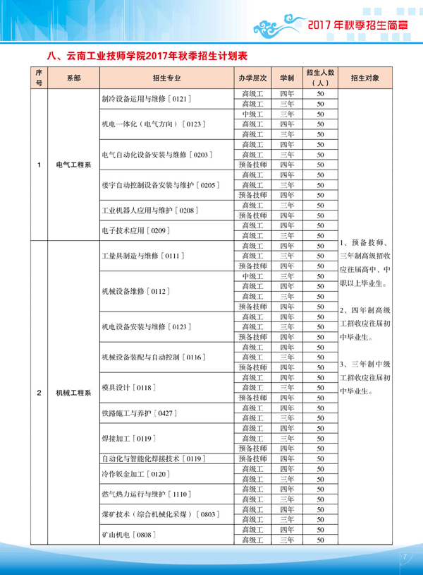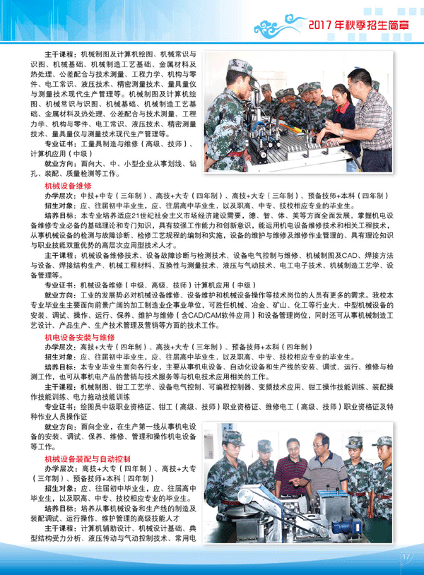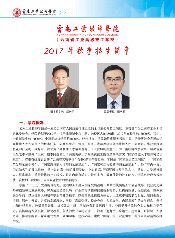 云南工业技师学院2017年秋季招生简章