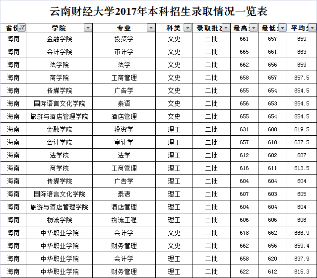 云南财经大学2017年海南省录取情况一览表