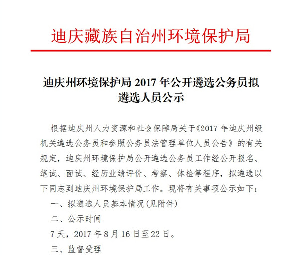 迪庆州环境保护局2017年公开遴选公务员拟遴选人员公示