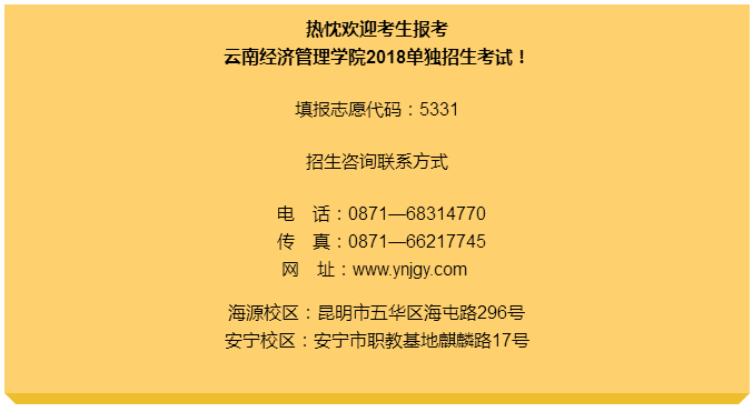 云南经济管理学院2018年单独招生章程、招生专业、招生计划、考试大纲及实施方案最终以云南招生考试院公布为准。