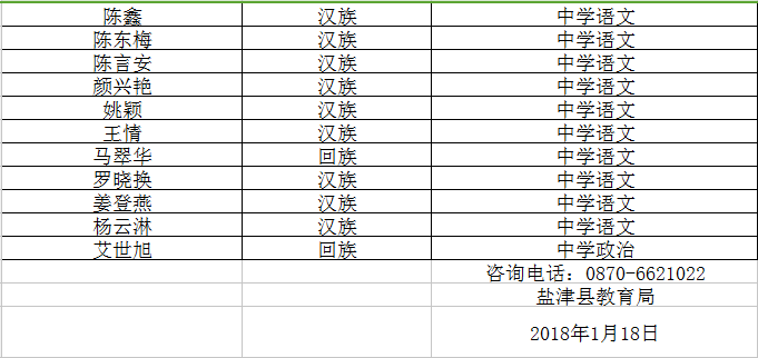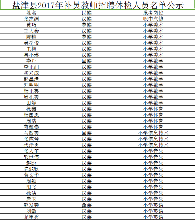 昭通市盐津县2017年补员教师招聘体检人员名单公示