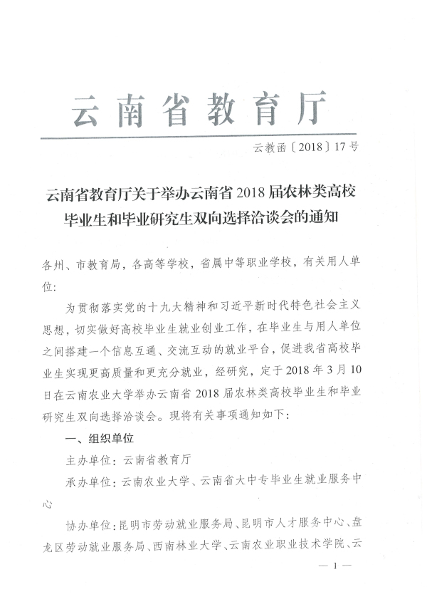 下载附件:云教函〔2018〕17号_云南省教育厅关于举办云南省2018届农林类高校毕业生和毕业研究生双向选择洽谈会的通知_附件.doc