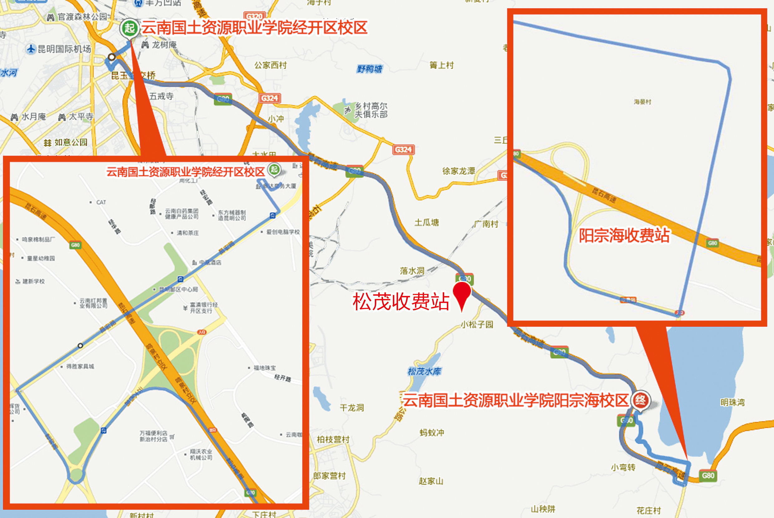 (2)从石林方向出发:昆石高速至阳宗出口下高速,左转按路标指示走4.5公里即可到校,导航可输入:玉溪市云南国土资源职业学院南门(阳宗海校区)。