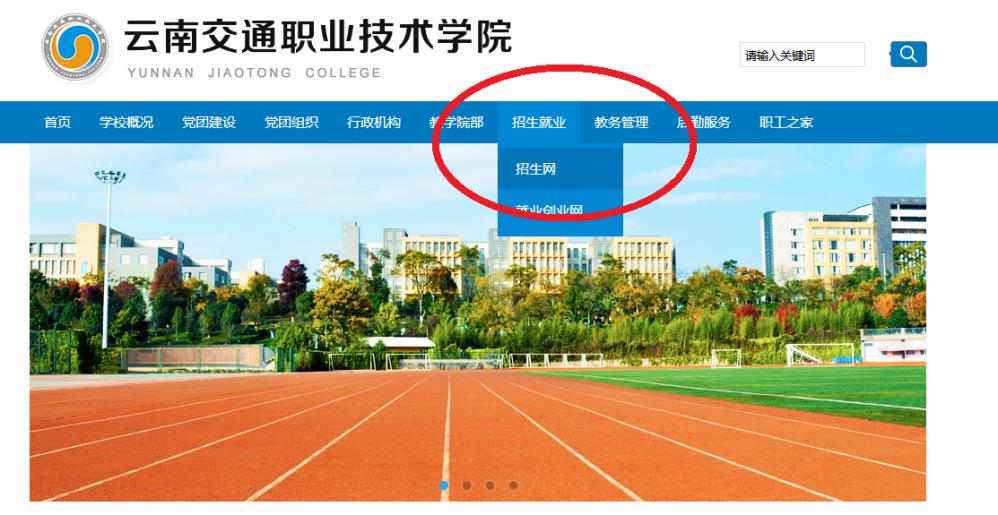 1、在电脑端输入网址www.ynjtc.com,进入云南交通职业技术学院官方网站,点击“招生就业”栏目下的“招生网”。