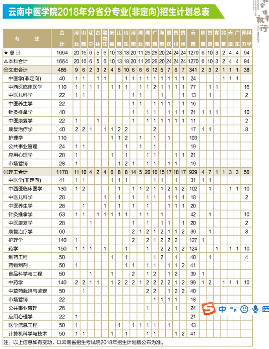 云南中医学院2018年分省分专业(非定向)招生计划表