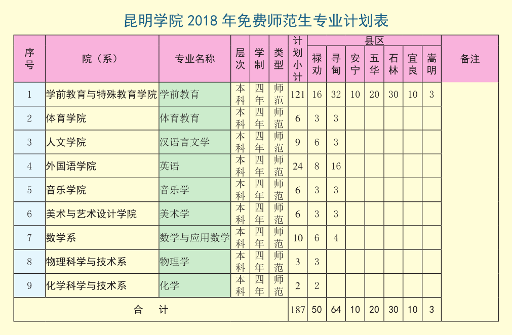 为贯彻落实《国家中长期教育改革和发展规划纲要》“积极推进师范生免费教育”和“扩大并完善免费师范生教育”的要求,满足昆明市“十三五”期间教育事业发展的需要,昆明学院将招收有志于长期从事基础教育事业、在德、智、体、美等方面符合教师职业的优秀学生,为昆明市定向培养更多适应昆明市社会经济发展所需的优秀中小学、幼儿教师。2018年,昆明学院定向昆明市免费师范生招生简章如下: