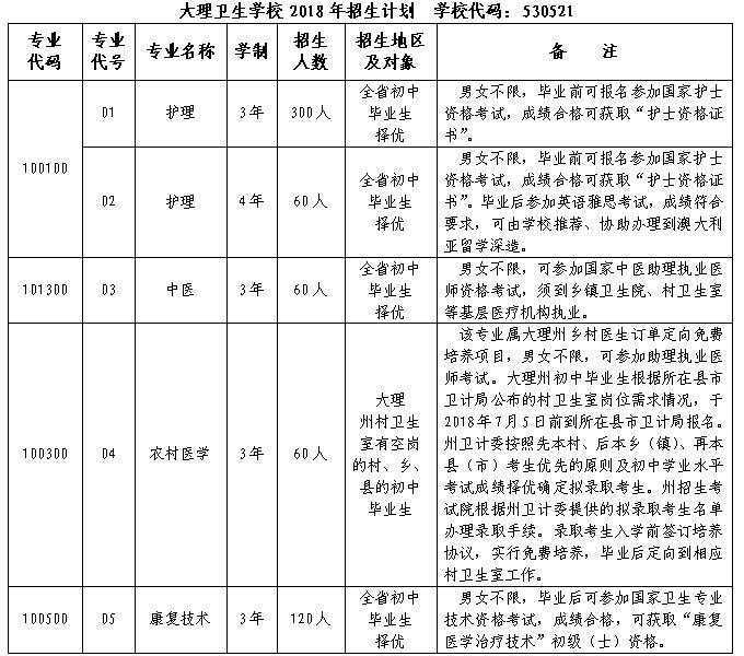 大理卫生学校属公办国家级重点中等职业学校,已有65年办学历史,是“国家现代服务业和制造业技能型紧缺人才护理专业培训基地”、“国家级护理实作实训基地”和“国家级中医药基础理论示范基地”,也是国家教育部和中医药管理局批准保留中医专业招生的中等专业学校。学校教育教学质量高,学生连年在全国、全省中职学生技能大赛获奖。学校设立了职业技能培训中心、职业技能鉴定所,设立了三校生高考、成人高考报名确认点,为学生取得国家职业证书、升学提高学历创造了良好条件,毕业生就业率高,就业遍布云南省及北京、上海、广州、深圳、厦门、福州、南宁等发达地区。