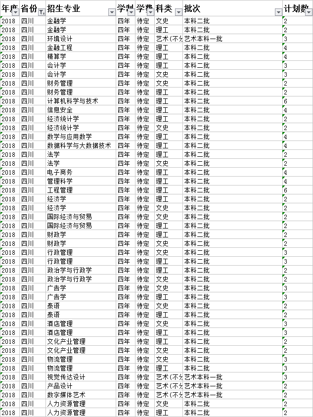 云南财经大学2018年本科分省招生计划表(四川)