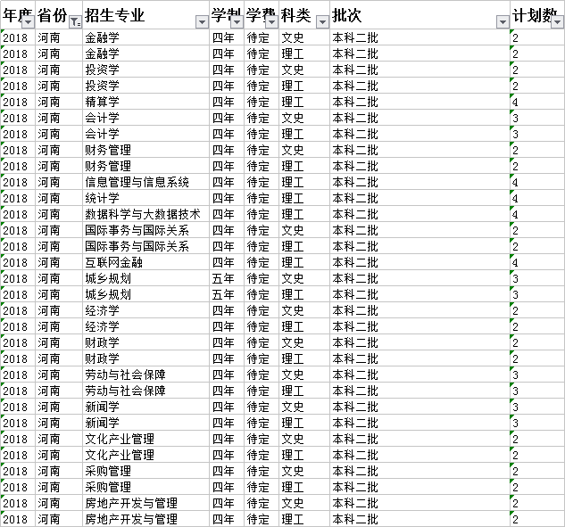 云南财经大学2018年本科分省招生计划表(河南)