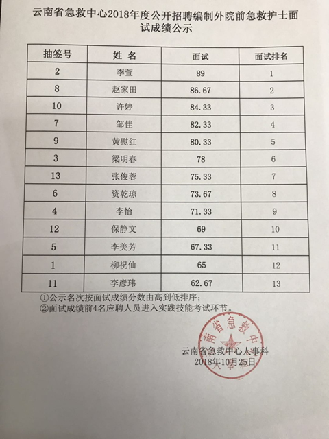 云南省急救中心2018年度公开 招聘编制外院前急救护士面试成绩公示