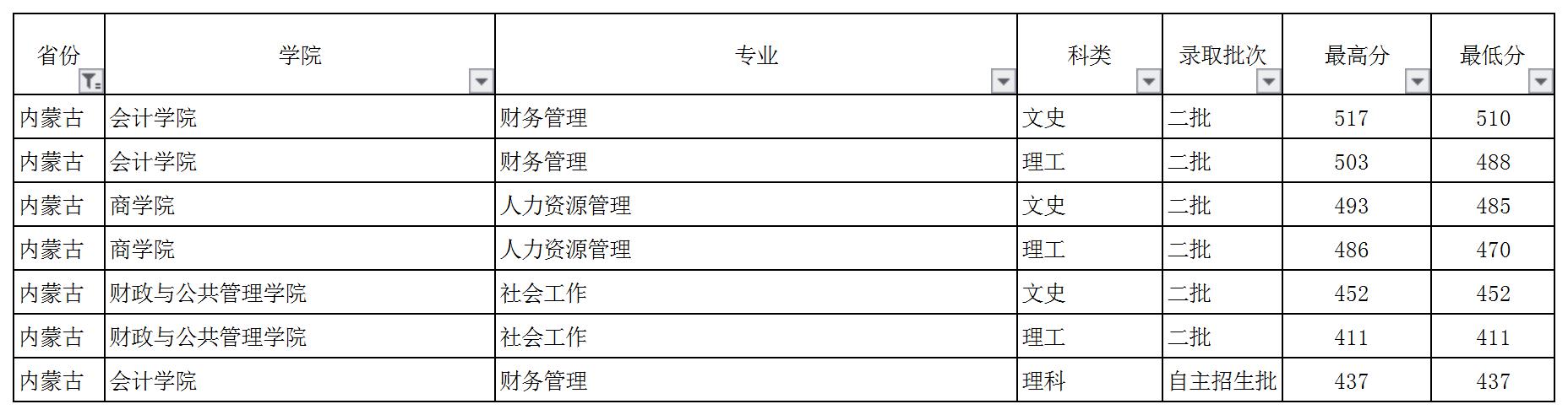 云南财经大学2018年内蒙古录取情况一览表
